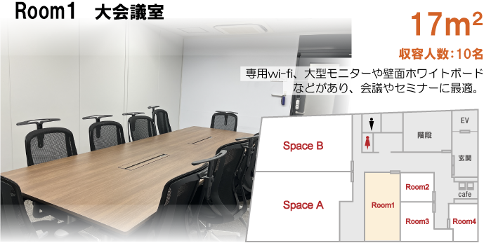 | 会議室の種類 | Space A+B | Space A | Space B | Room1 |